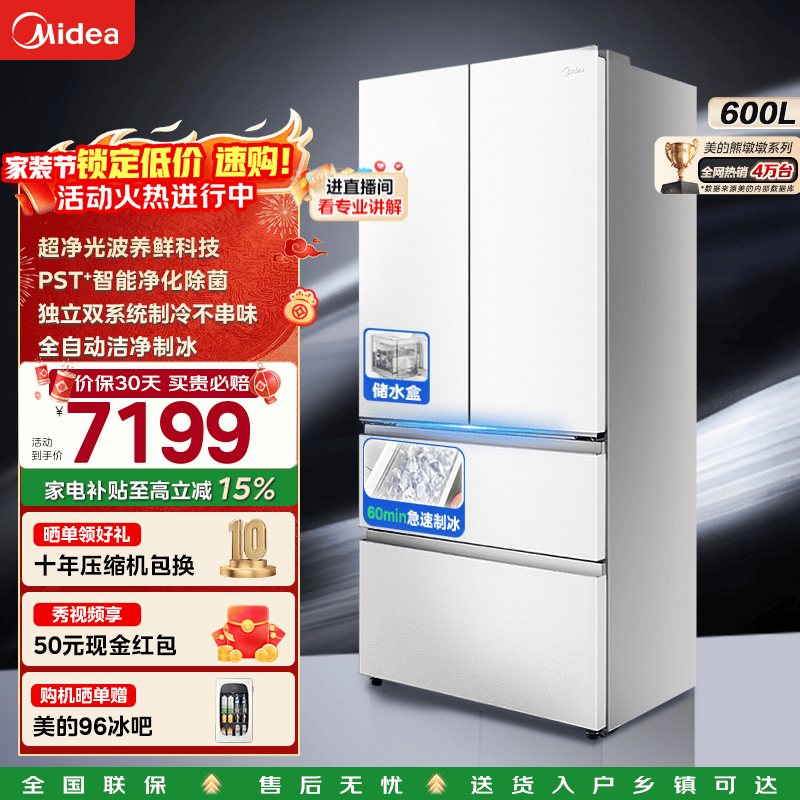 旗舰店美的(Midea)熊墩墩Pro600L法式多门四开门冰箱双系统超薄嵌入家用大容量制冰一体除菌净味电冰箱一级国家补贴 BCD-600WUFIPZM(E)海贝白