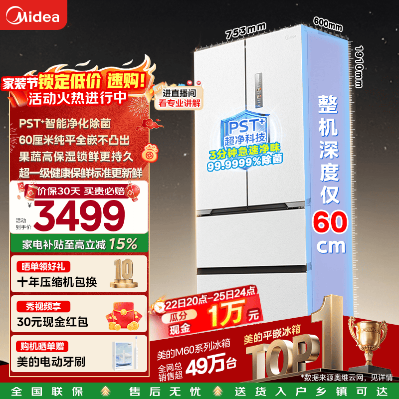 旗舰店美的(Midea)M60全净系列470法式多门60厘米纯平全嵌底部散热大容量一级双变频风冷无霜智能家用冰箱政府补贴 MR-470WUFPZE 曦云白