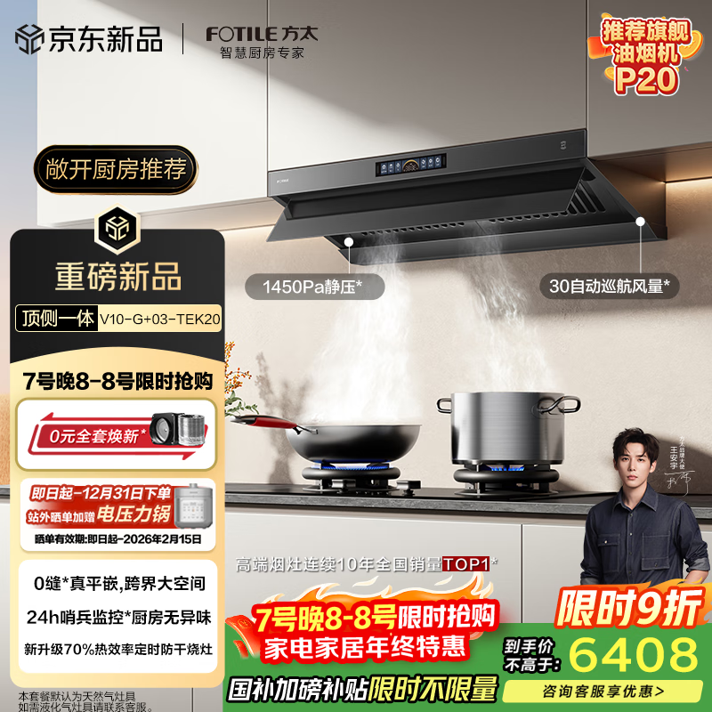 自营方太【官方主推烟灶套装】V10-G+03-TEK20 顶侧一体30风量+70%热效定时防干烧天然气灶 抽吸油烟机灶具