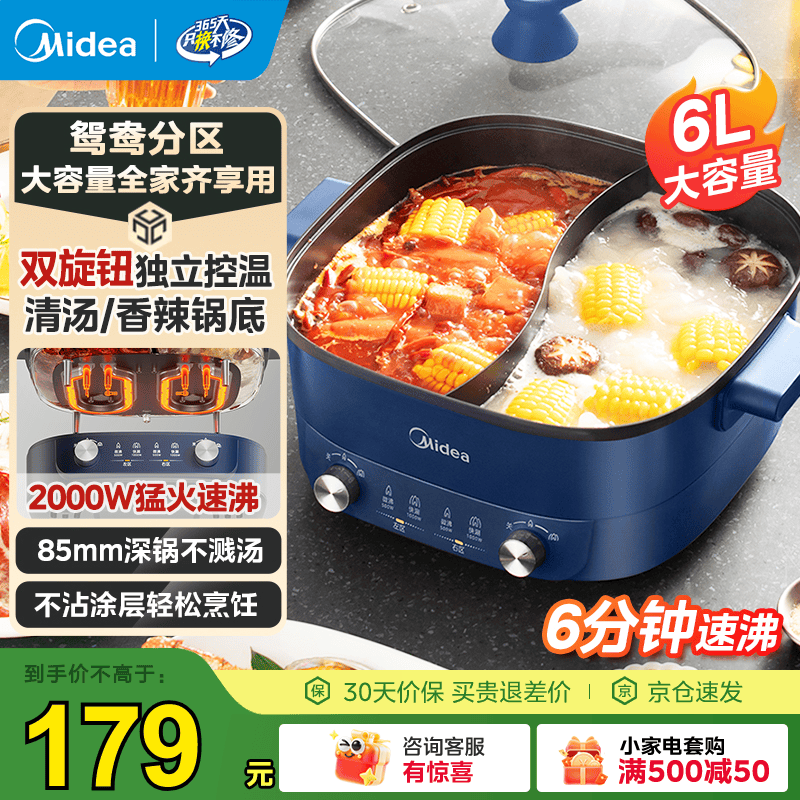 百亿补贴美的(Midea)电火锅 鸳鸯锅 火锅专用锅 电煮锅多功能锅6分钟速沸双旋钮分区双控家用电热锅6L多用途锅火锅锅 6L 【2000W猛火速沸】 HGC303012