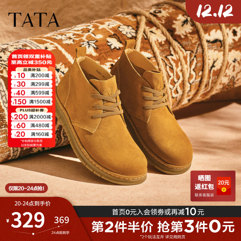 旗舰店他她(TATA)复古棕色皮鞋男鞋加绒真皮高帮鞋短靴子ODV01DD4 黄棕(绒里) 43