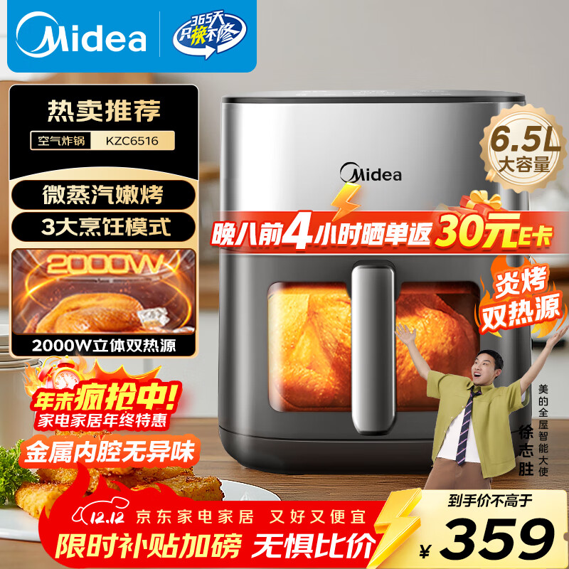 自营美的(Midea)新款炎烤空气炸锅上下双热源 可视大视窗电子触控 家用6.5L大容量 蒸烤一体金属内腔 MF-KZC6516