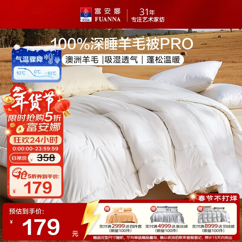 自营富安娜×京东定制羊毛被100%澳洲羊毛冬被双人保暖冬季被芯203×229cm