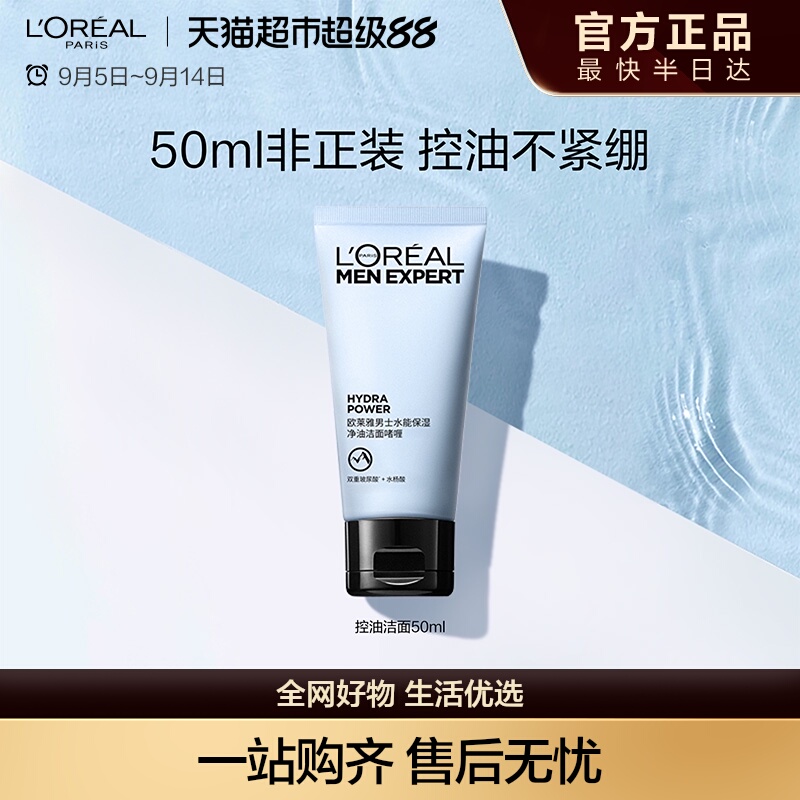 欧莱雅男士水能保湿补水净油洁面啫喱50ml*1支面部清洁氨基酸男
