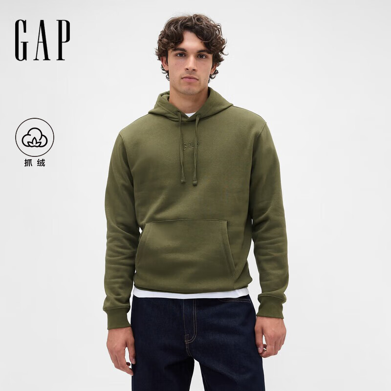 旗舰店GAP男女装2025秋季新款Logo刺绣抓绒宽松连帽衫卫衣美版 军绿色 M 美码 L亚洲码180/96A