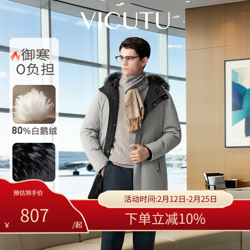 旗舰店威可多(VICUTU)【大保温舱三代】男士中长款冬季加厚连帽鹅绒服 灰白色 L 175/96B