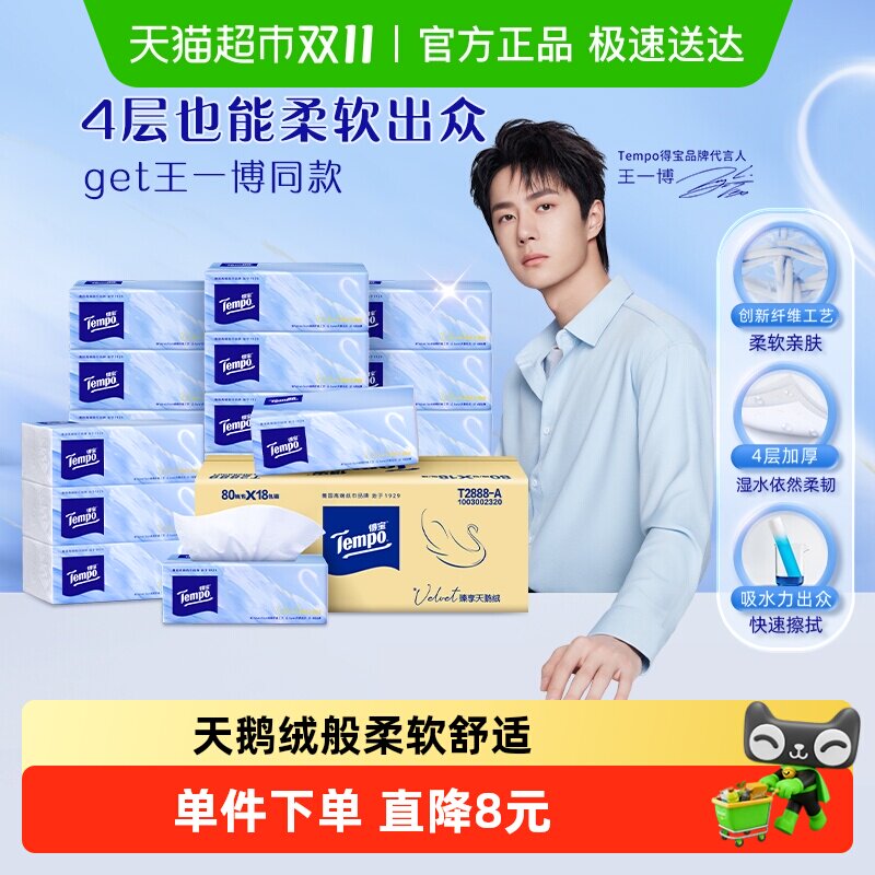 【4层也能柔软出众】Tempo/得宝Velvet臻享天鹅绒软抽纸箱装