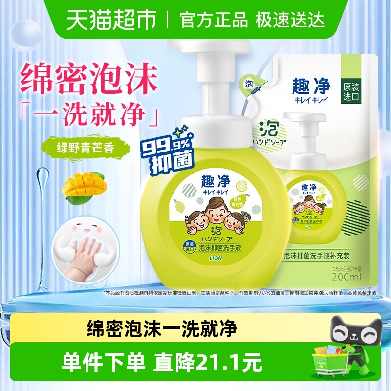 狮王趣净泡沫抑菌洗手液绿野青芒香套装l家庭儿童易冲洗