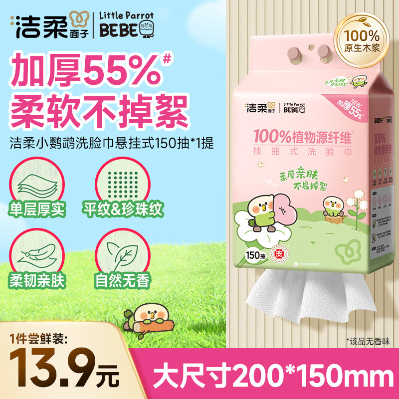 自营洁柔洗脸巾悬挂式加厚棉柔洁面巾 母婴可用小鹦鹉联名150抽一次性毛巾