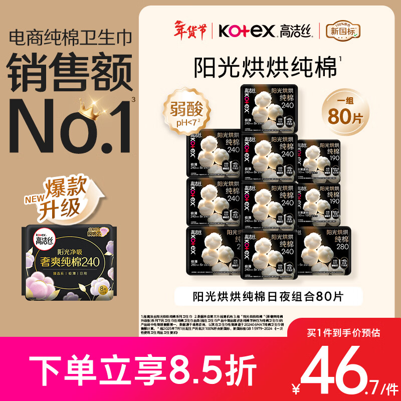 自营高洁丝【纯棉NO.1】阳光烘烘卫生巾10包80片日夜组合姨妈巾自营