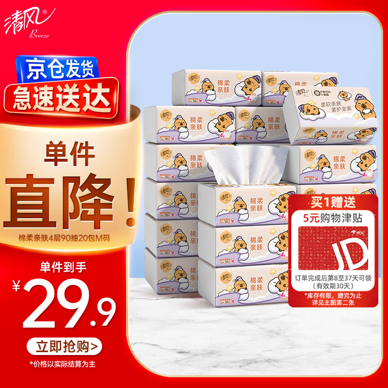 自营清风(APP)【李昀锐同款】抽纸 卡皮巴拉4层90抽*20包M码 卫生纸巾抽 整箱