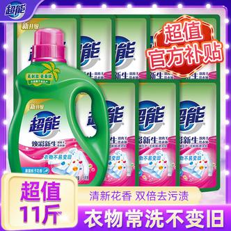 旗舰店超能双离子洗衣液11斤1瓶8袋香味持久家用实惠护色护衣焕彩新生