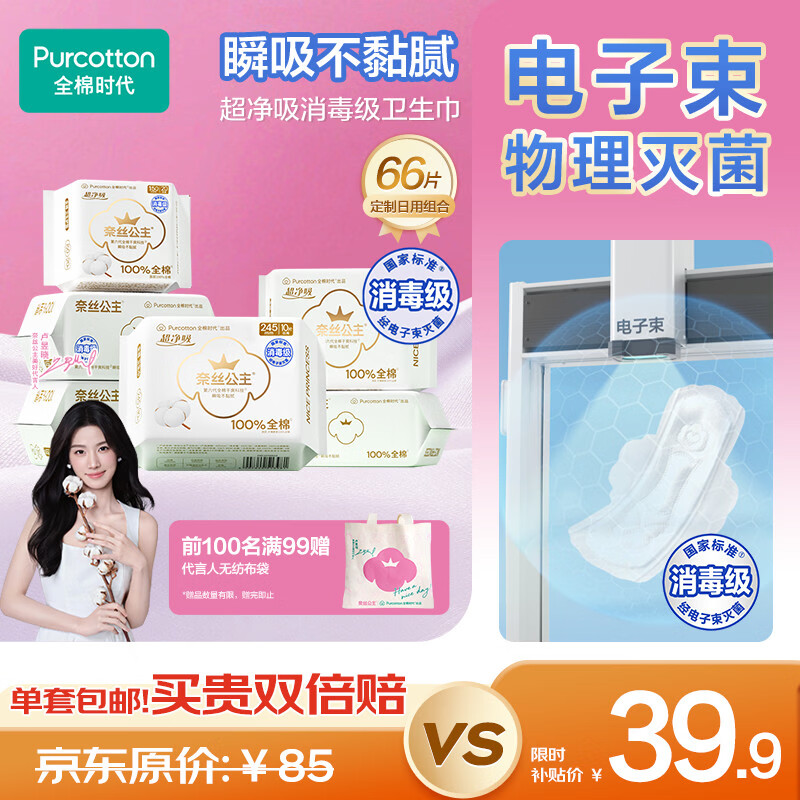 自营全棉时代【卢昱晓推荐】奈丝公主超净吸日用卫生巾66片(150*20p+245*46p)