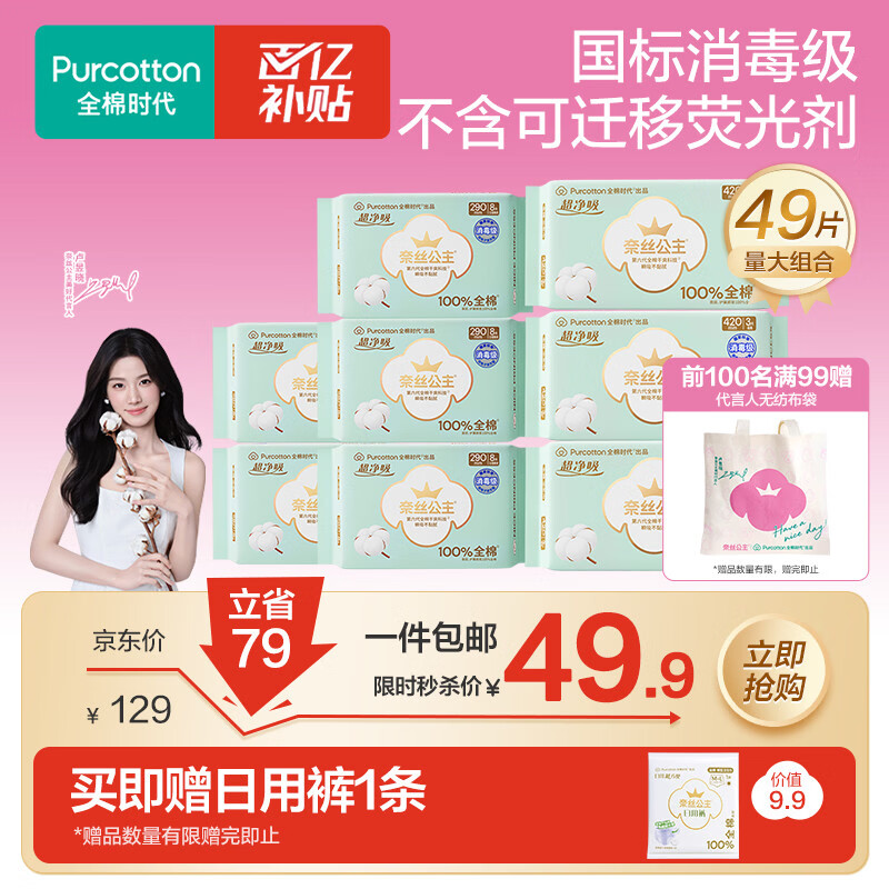 自营全棉时代奈丝公主消毒级超净吸量大夜用卫生巾49片(290*40p+420*9p)自营
