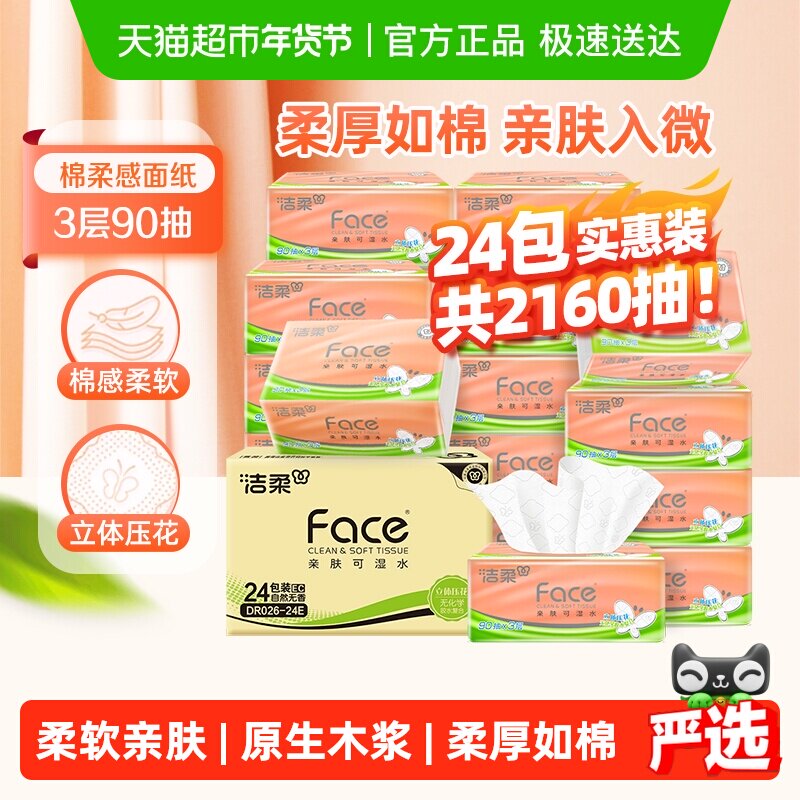 自营洁柔抽纸 粉Face柔韧3层120抽*20包 可湿水面巾纸 整箱纸巾 热门商品