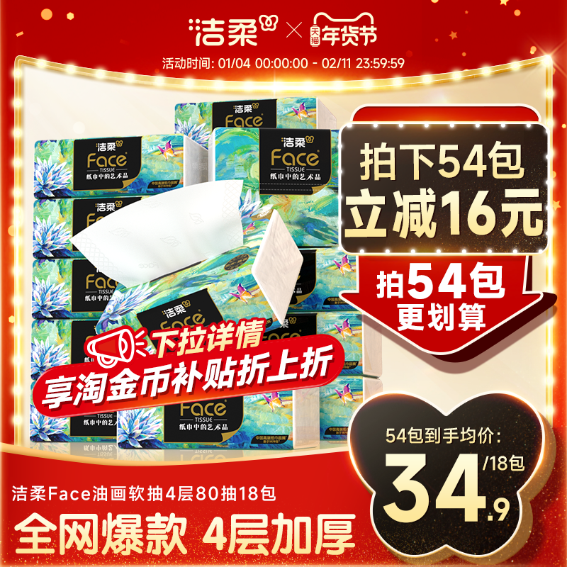 旗舰店洁柔油画抽纸可湿水面巾纸家用擦手纸实惠装加厚纸巾4层卫生纸