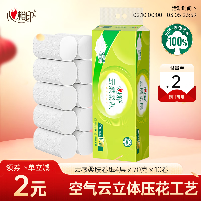 自营心相印【田栩宁推荐】无芯卷纸 云感柔肤 4层70g*10卷 卫生纸 柔厚耐用