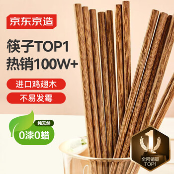 自营京东京造 筷子 家用食品级餐具实木防滑鸡翅木原木【无漆无蜡】10双装