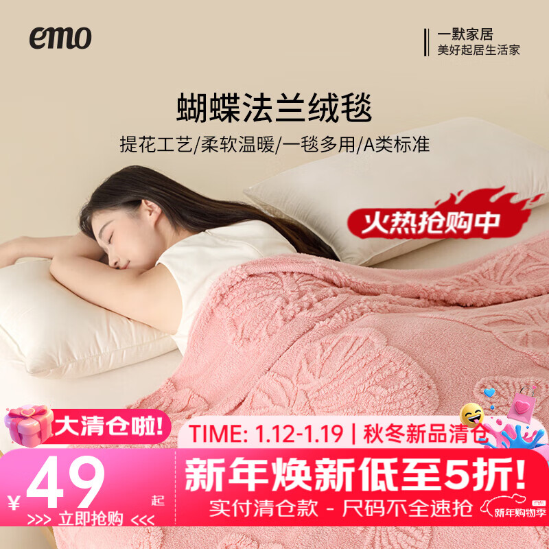 旗舰店一默毛毯秋冬办公室午睡毯居家沙发盖毯加厚保暖双面绒蝴蝶法兰绒毯子 莓粉(多用途绒毯) 100*150cm(办公午睡)