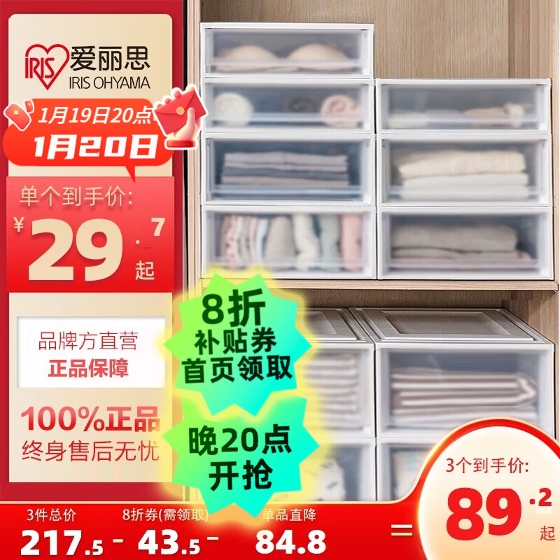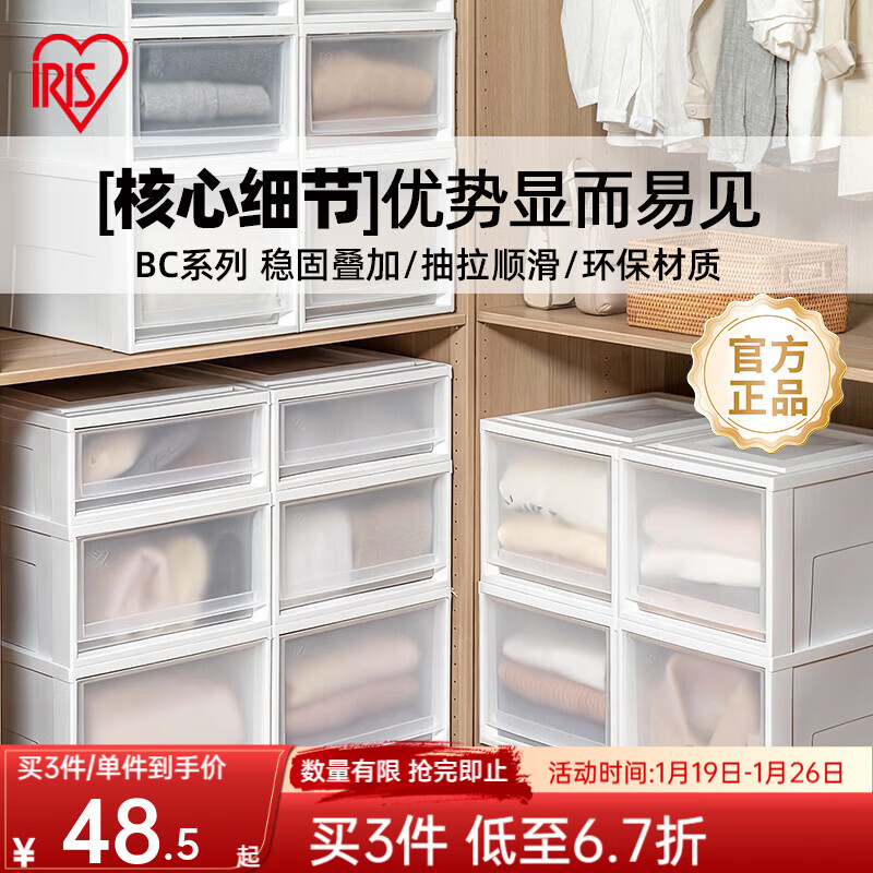 旗舰店爱丽思(IRIS)【买3免1】抽屉式收纳箱衣柜透明收纳盒塑料整理箱衣服储物柜子丝 37L BC-450 白色
