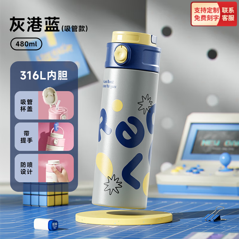 旗舰店物生物(RELEA)保温杯儿童吸管杯316L不锈钢水杯女生高颜值便携小学生上学专用 灰港蓝【吸管款】480ml