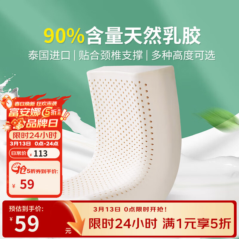 旗舰店富安娜(FUANNA)家纺 枕头芯泰国原液进口乳胶枕护颈枕头枕芯颈椎枕(优选) 小孩枕【抗菌升级】-44*27cm 单只 乳胶枕