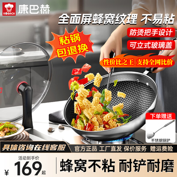 旗舰店康巴赫(KBH)炒锅不粘锅不锈钢炒菜锅蜂窝平底煎炒锅电磁炉燃气灶通用 【升级款】+可立盖 30cm