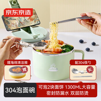 自营京东京造 泡面碗 上班族304不锈钢饭盒小学生双层防烫1.3L绿色 配筷勺