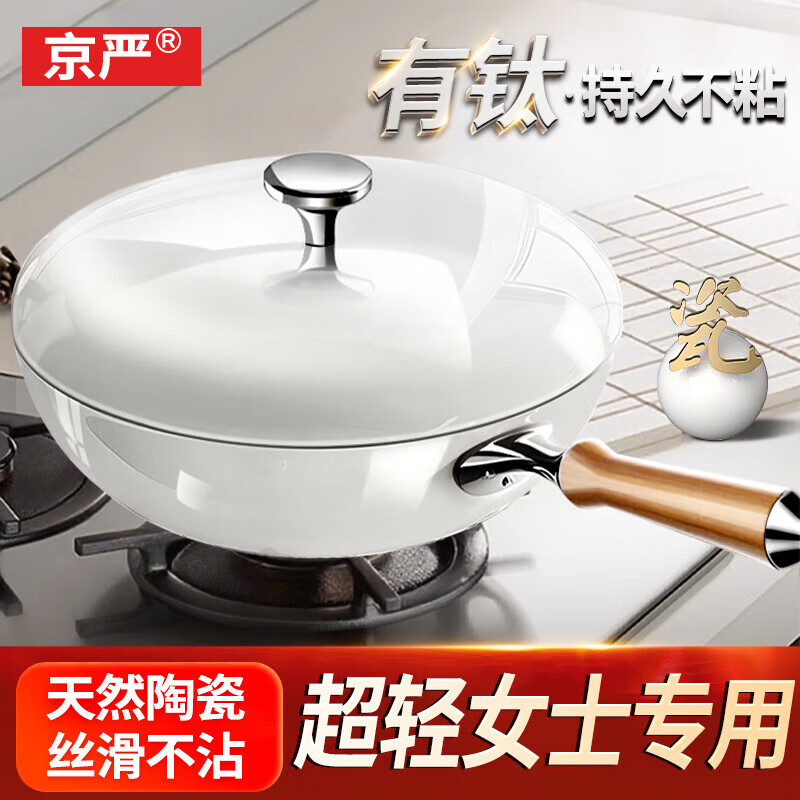 旗舰店京严钛陶瓷炒锅不粘锅有钛无氟涂层家用炒菜锅钛炒锅燃气灶电磁炉通用 炒锅+高拱铁盖 30cm 【0氟涂层 1级不粘】