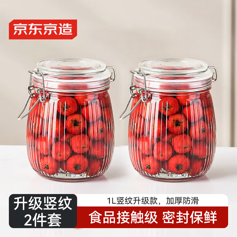 自营京东京造咔嗒玻璃密封罐储物罐家用玻璃瓶泡酒瓶泡菜瓶 1L 2只装