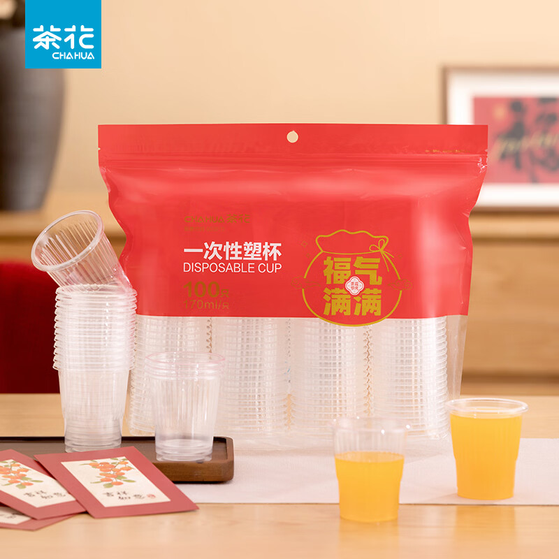 旗舰店茶花(CHAHUA) 茶花一次性杯子家用办公室加厚咖啡水杯商用惠享纸杯 塑杯 100只 170ml【新年喜庆装】