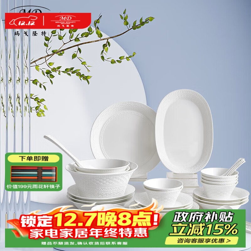 自营玛戈隆特碗碟套装国瓷高端餐具纯白浮雕事事如意6人份32头