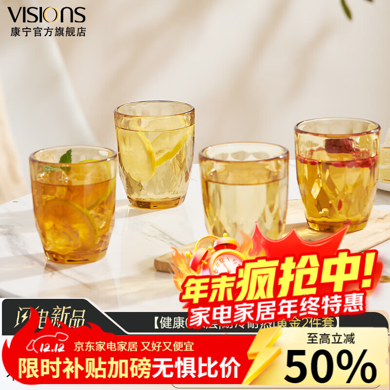 旗舰店VISIONS康宁饮水杯高硼硅耐高温玻璃杯花茶杯子单层果汁杯牛奶杯水杯男女 康宁-钻石水杯(四件套)