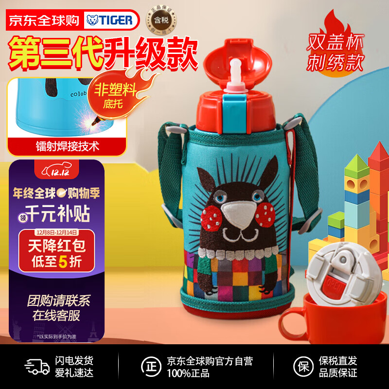自营虎牌(TIGER)保温杯儿童保温杯水杯杯子双杯盖MBR-S06G-AA吸管款小针鼹600ML