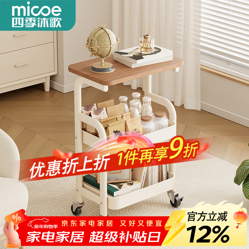旗舰店四季沐歌厨房置物架落地折叠小推车置物架免安装零食收纳储物移动果蔬菜篮 【中古风】奶白色-三层