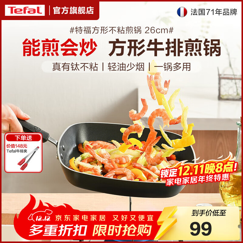 旗舰店特福(Tefal)平底锅煎锅不粘锅家用煎蛋锅方形牛排煎锅少油烟燃气灶用 几何煎锅 26cm