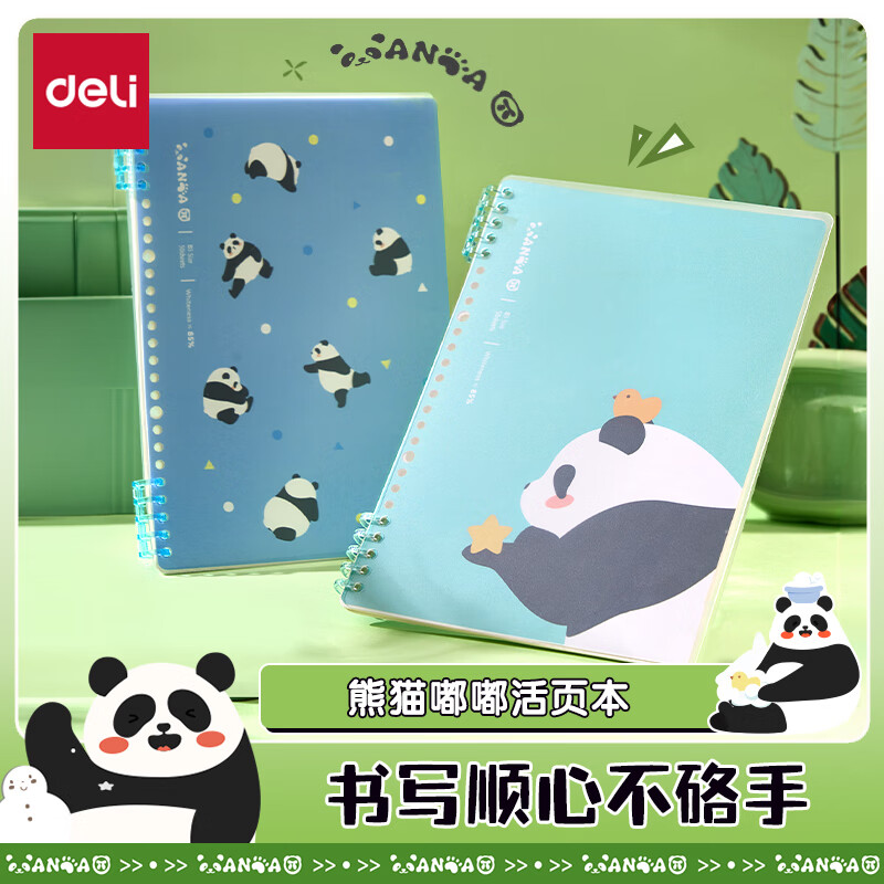 自营得力(deli)熊猫嘟嘟活页本可开合线圈本B5笔记本记事本50张/本 BDHB5-01绿色