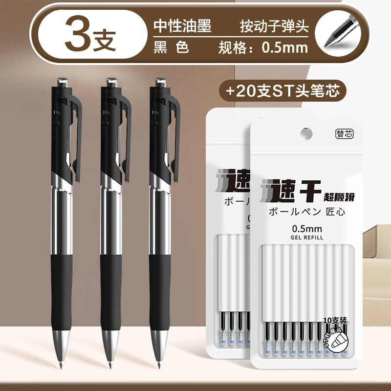 斯美奇按动中性笔笔芯0.5mm黑色学生用蓝红色按动笔芯签字笔批发k35巨能写学生办公碳素笔考试笔按压式 黑色(按动款中性笔) 20笔芯+3支笔