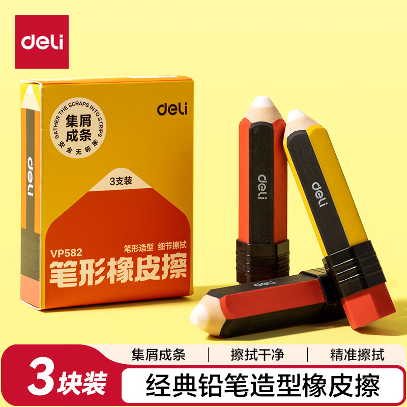 自营得力(deli)3块装笔形橡皮擦经典款橡皮笔铅笔造型可爱高颜值橡皮擦集屑易擦不易留痕擦拭干净小学生必备文具