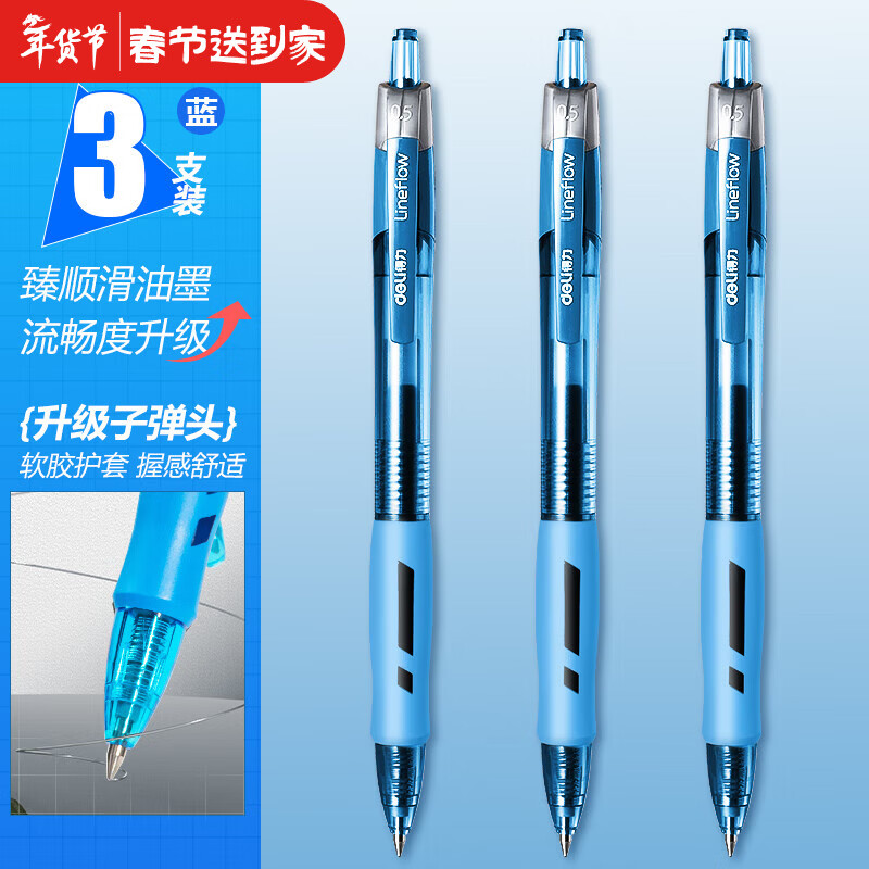 得力(deli)臻顺滑中性笔按动子弹头签字笔0.5mm学生考试专用刷题笔处方笔商务办公按压式碳素水笔 3支蓝色