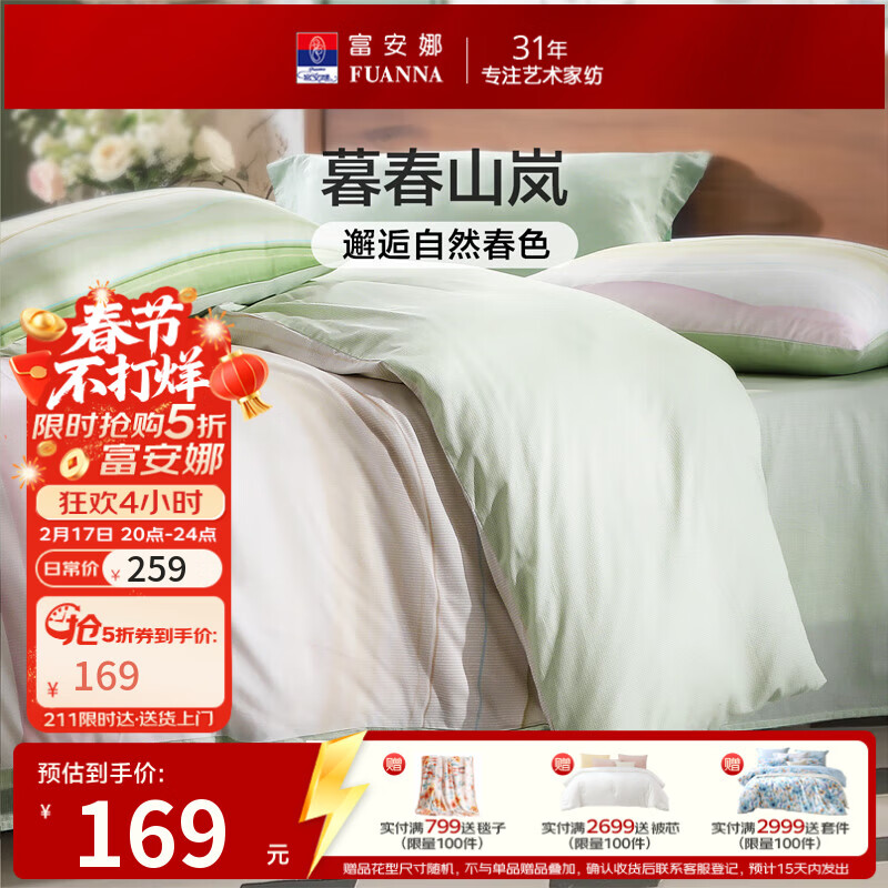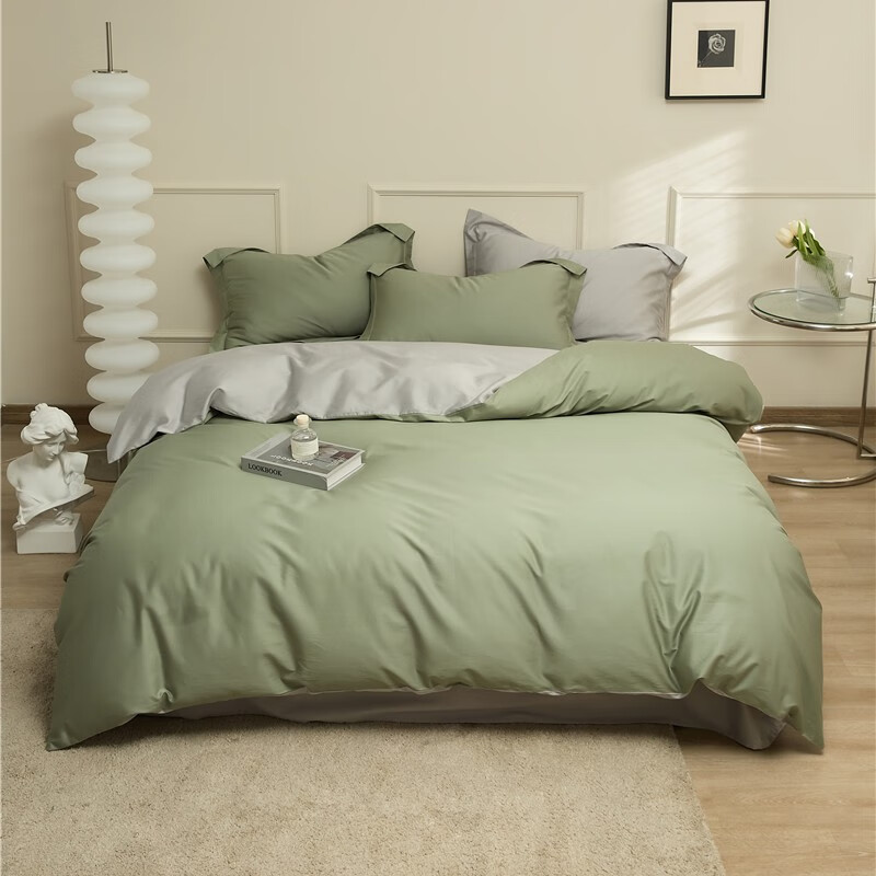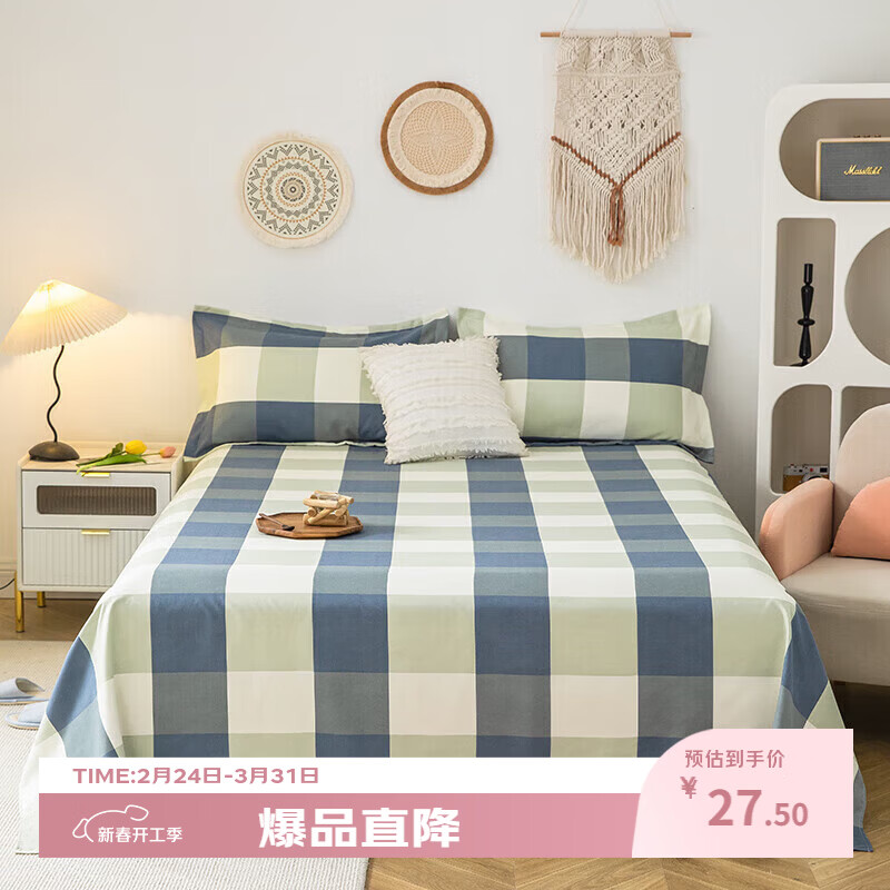 旗舰店富安娜床上四件套纯棉100%全棉透气床单被套双人1.8米x2米床中性男生 山岚绿【纯棉亲肤/双面可用】 1.2米 床单款 (被套152*210cm)