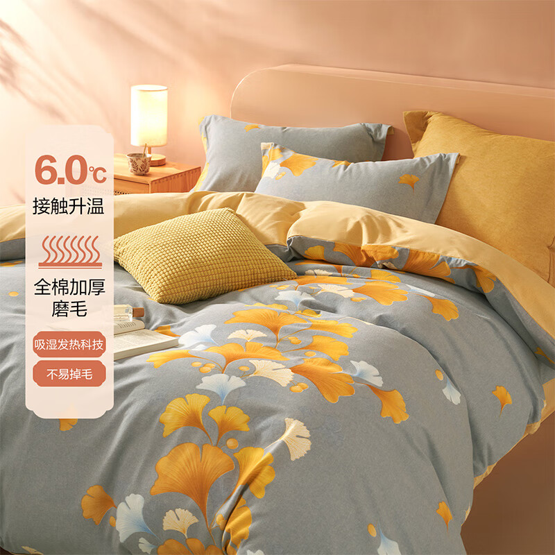 旗舰店水星家纺出品百丽丝套件 秋冬磨毛套件三/四件套居家床单被套床上用品 秋杏(全棉磨毛&吸湿发热) 1.8米床 床单款 (被套220*240cm)