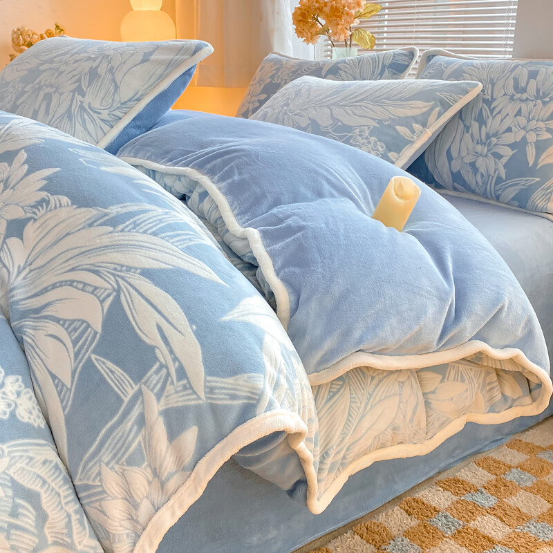 轩蓝仕(Xanlenssi)A类加厚拉绒雕花牛奶绒冬季保暖四件套 床笠水晶绒加密型绒套件 空谷幽兰-兰-mf 床单款1.8米床(被套200*230cm)