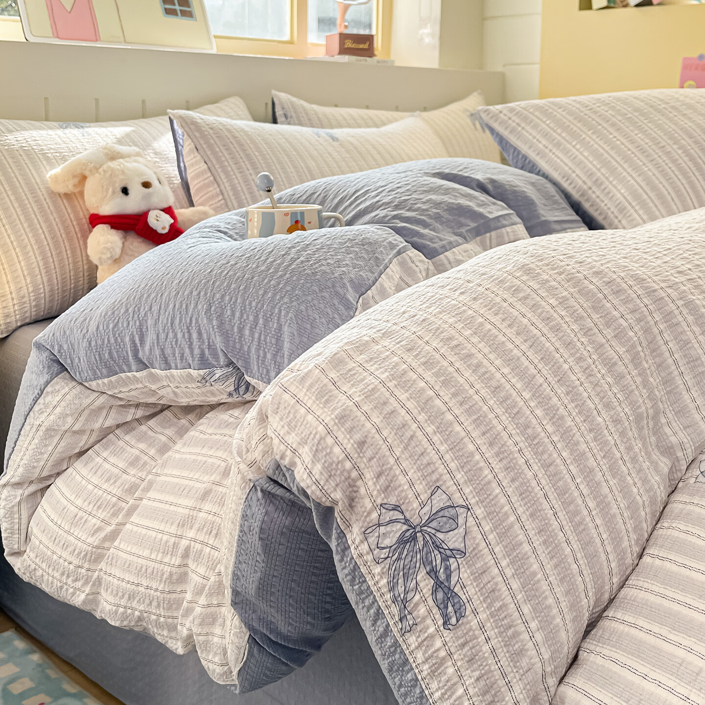A类针织棉双层纱四件套小清新超柔泡芙纱泡泡纱床上用品 蝴蝶结兰 1.8床 床单款 (被套200*230cm)