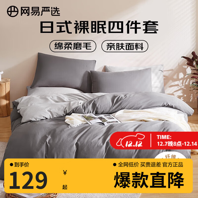自营网易严选日式裸眠亲肤磨毛宿舍四件套酷灰色床单被套1.5m床/2mx2.3m被芯