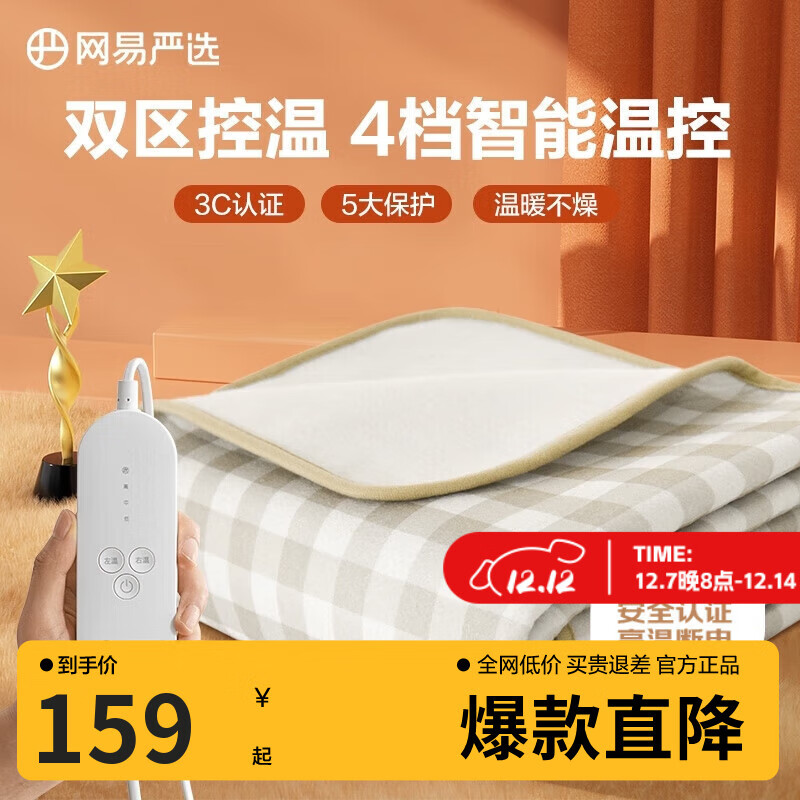 旗舰店网易严选 电热毯抗菌双人电褥子双温双控除螨除湿自动断电家用电暖毯子 【双区控温】格子款 180cm*150cm
