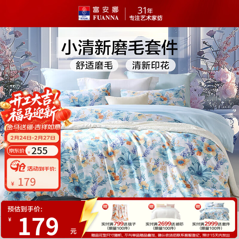 旗舰店富安娜出品 圣之花床品四件套 全涤双面磨毛套件双人被套罩ins风 【亲肤磨毛花卉款】蓝调 1.5米 床单款 (被套203*229cm)