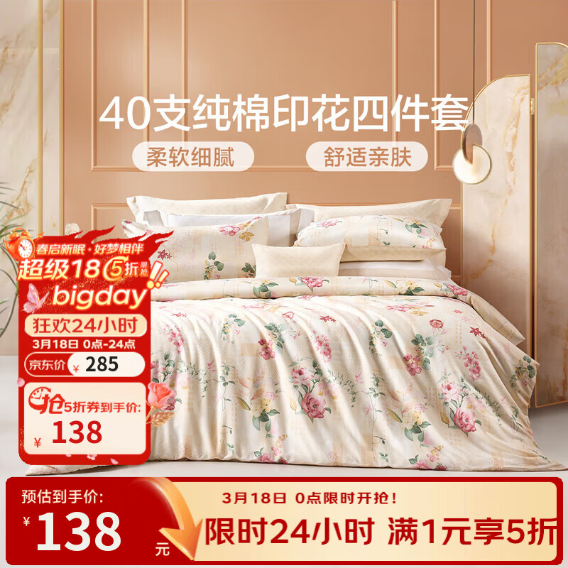 旗舰店富安娜家纺 圣之花床上四件套纯棉床品套件双人床单被套 圣之花-【纯棉】风华系列-温暖调 1.5米床 床单款 (被套203*229cm)