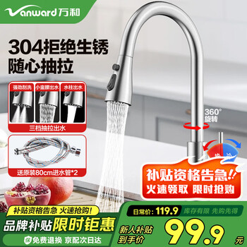 自营万和厨房水龙头冷热三功能抽拉式出水304不锈钢洗菜盆水槽龙头360旋转