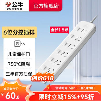 旗舰店公牛插座/插线板/宿舍插排/排插/接线板/拖线板/电插板/长线带开关/带儿童保护门/新国标 B5系列 【六位分控1.8米】B5063 全长1.8米